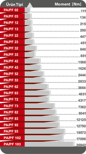PA/PF 02 ‘den 52‘ye kadar 2 kademeli redüktörlerimiz mevcuttur. PA/PF 02‘den PA/PF 52‘ye kadar olan 2 kademeli redüktörlerimiz daha yüksek tahvil oranlarında gövde dayanımını arttırarak 3 kademeli olarak üretilebilmektedir. Bu 3 kademeli redüktörler PA/PF 03 PA/PF 53 adı altında dizayn edilmiştir.